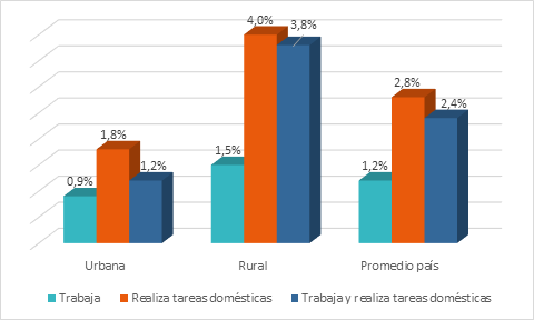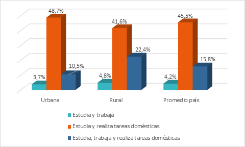 Si consideramos solamente la situación de trabajo, un 6,4% no estudia y se dedica únicamente a trabajar o realizar trabajo doméstico (Gráfico 2). Esta situación presenta mayores porcentajes en la zona rural, evidenciándose así las desigualdades territoriales.