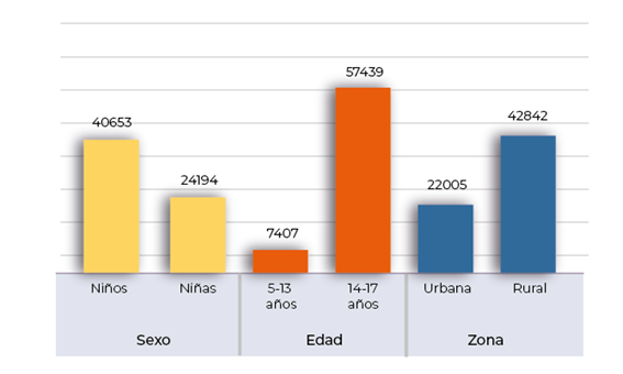 En cuanto a la asistencia a una institución educativa y trabajo infantil, el 15,6% de la población de 5 a 17 años no asiste a la escuela (64.847); situación que se agudiza en niños frente a las niñas, en la franja etaria de 14 a 17 años y en zonas rurales (Gráfico 3).