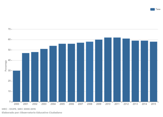 La tasa neta de escolarización para la EEB 3er ciclo[1] es de 58% a nivel país (2015). Se puede observar que en los años 2010 y 2011 la misma ha llegado al mayor porcentaje (62%) pero a partir de allí ha venido disminuyendo (MEC, DGPE, SIEC, 2015).