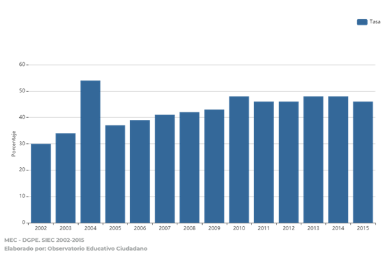 Por el contrario, para la educación media, la tasa neta de escolarización[2] llega tan solo al 46% a nivel país (2015), visualizándose que en el año 2004 se logró la mayor tasa de escolarización (54%). Los datos evidencian que la escolarización disminuye a medida que avanzan los años de estudio, sobre todo esto debido a las necesidades de ayuda económica que requieren muchas familias, donde son los jóvenes quienes colaboran con dichas tareas.