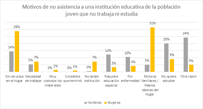 Entre los principales motivos por los cuales los jóvenes no asisten a la institución educativa se encuentran aquellos relacionados a motivos familiares, con mayor preponderancia para las mujeres (31%) frente a los hombres (5%); sin recursos en el hogar representando 29% para las mujeres, frente a un 14% para los hombres, aspecto que esta también vinculado a la necesidad de trabajar, 7% mujeres y 5% hombres (EPH, 2019). Estos datos dan cuenta de una brecha cultural en la educación joven, donde las mujeres dejan de asistir a la escuela para colaborar en las labores del hogar, dando por sentado ese “rol” al sexo femenino.