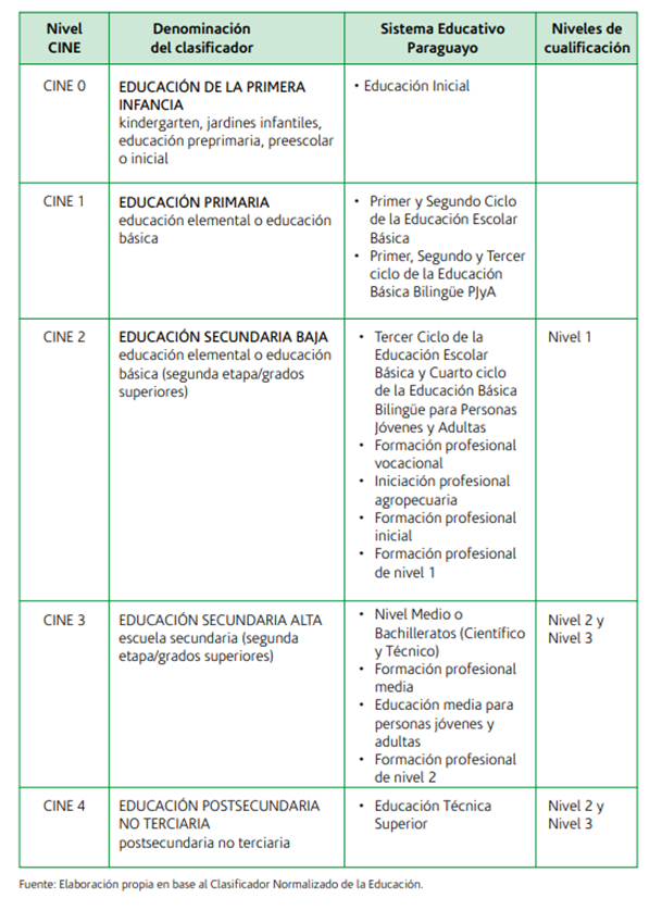 Para propósitos de comparación a nivel internacional, se usa el término “educación de la primera infancia” para denominar al nivel CINE 0. A los efectos del ordenamiento de las ofertas formativas en Paraguay, se considera por las características y exigencias del programa educativo que se desarrolla, que la Educación Inicial está bajo el nivel del CINE 0.